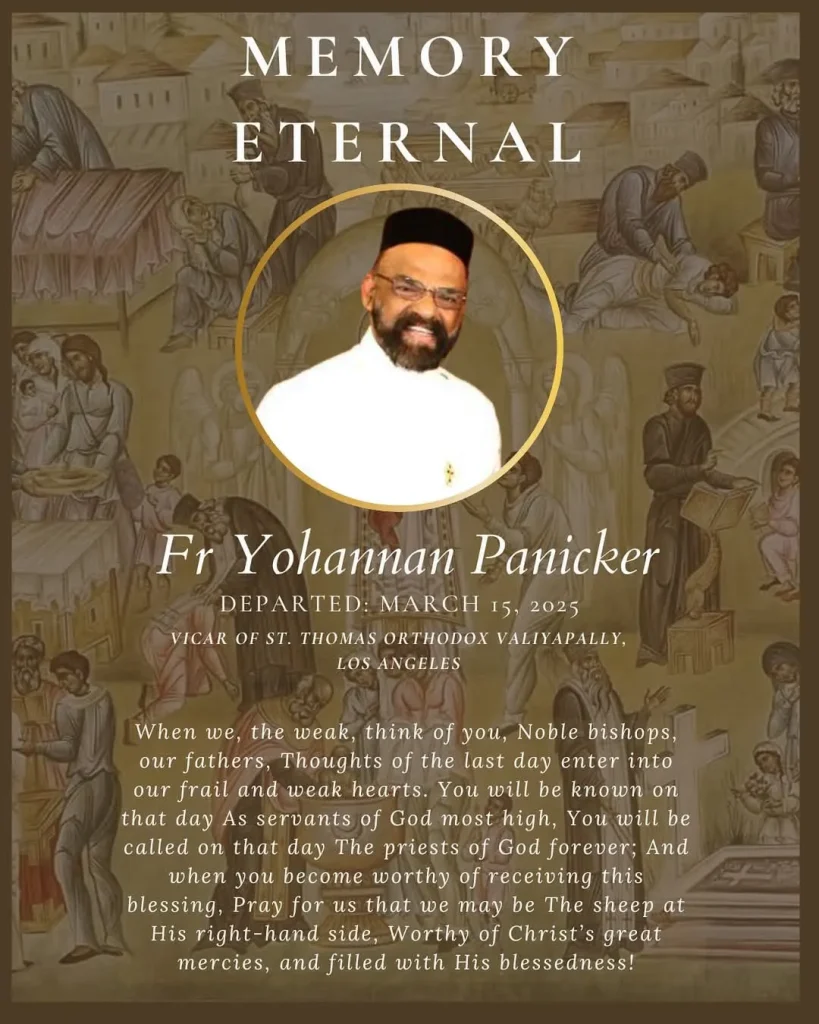 With profound sorrow, yet steadfast hope in the resurrection of our Lord, we share the passing of Rev. Fr. Yohannan Panicker (Panicker Achen) in Los Angeles on 3/15/2025 early morning. We ask for your prayers for his departed soul and for the comfort of his grieving family. May God grant them strength and peace during this difficult time. Further details will be shared as they become available.